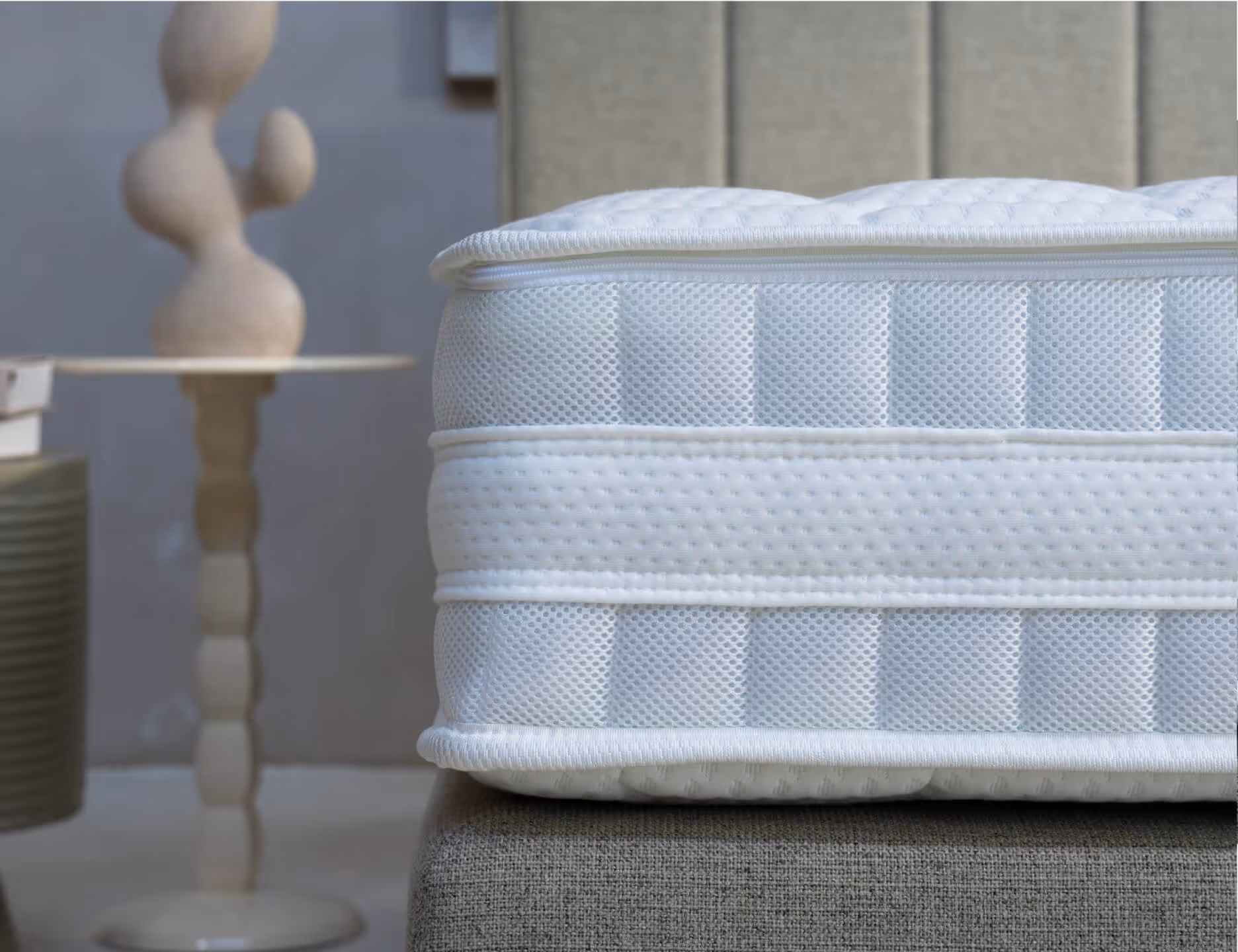 De veren lopen volledig door tot aan de zijkant. Dat betekent minder schuim, betere ventilatie en een stabiel liggevoel over de volle breedte.